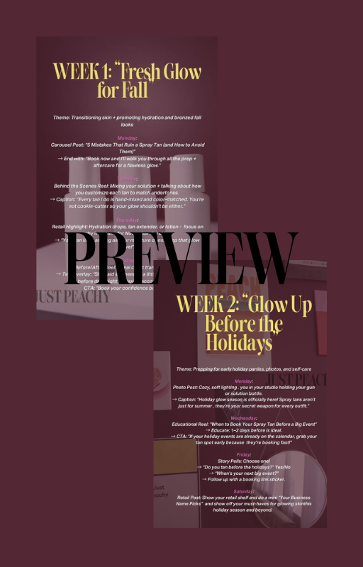 If you’re tired of wondering what to post or struggling to keep your spray tan business visible on Instagram, this November Content Calendar was made for you. Designed specifically for spray tan artists, beauty pros, and sunless studios, it’s your plug-and-play guide ( add your own personality !) to showing up confidently online with no stress, no burnout, just glowing results.